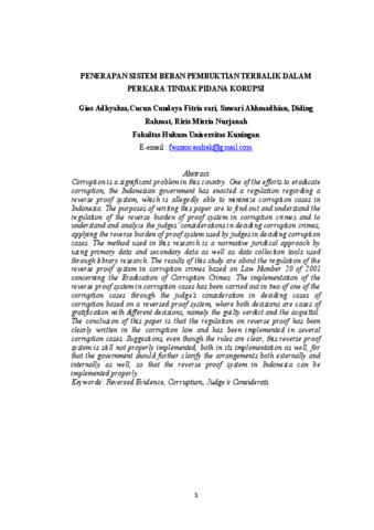Korupsi merupakan masalah yang cukup signifikan di negara ini. Salah satu upaya untuk memberantas korupsi, pemerintah Indonesia telah memberlakukan sistem pembuktian terbalik. Tujuan penulisan skripsi ini untuk mengetahui dan memahami mengenai pengaturan terhadap sistem beban pembuktian terbalik dalam tindak pidana korupsi dan untuk memahami dan menganalisis pertimbangan hakim dalam memutus tindak pidana korupsi penerapan sistem beban pembuktian terbalik yang digunakan hakim dalam memutus perkara tindak pidana korupsi. Metode yang digunakan dalam penelitian ini adalah dengan pendekatan yuridis normatif dengan menggunakan data primer dan data sekunder serta alat pengumpul data yang digunakan melalui studi kepustakaan. Hasil penelitian ini adalah mengenai pengaturan tentang sistem pembuktian terbalik dalam tindak pidana korupsi berdasarkan Undnag-Undang Nomor 20 Tahun 2001 tentang Pemberantasan Tindak Pidana Korupsi. Penerapan sistem pembuktian terbalik ada pada dua dari salah satu perkara korupsi melalui pertimbangan hakim dalam memutus perkara tindak pidana korupsi berdasarkan sistem pembuktian terbalik, dimana kedua putusan merupakan perkara gratifikasi dengan putusan yang berbeda, yakni putusan bersalah dan putusan bebas. Simpulan dari penulisan ini adalah mengenai pengaturan tentang pembuktian terbalik telah jelas tertulis dalam undang-undang tipikor dan sudah diimplementasikan dalam beberapa kasus korupsi. Saran, walaupun telah jelas mengenai aturannya, sistem pembuktian terbalik ini masih belum diterapkan semestinya, untuk itu agar pemerintah dapat lebih memperjelas pengaturan baik internalnya juga, agar sistem pembuktian terbalik di Indonesia dapat dilaksanakan dengan semestinya
