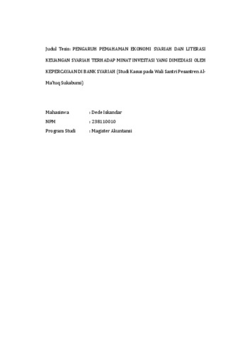 Iskandar, Dede (2026) ENGARUH PEMAHAMAN EKONOMI SYARIAH DAN LITERASI KEUANGAN SYARIAH TERHADAP MINAT INVESTASI YANG DIMEDIASI OLEH KEPERCAYAAN DI BANK SYARIAH (Studi Kasus pada Wali Santri Pesantren Al- Ma’tuq Sukabumi). UNSPECIFIED thesis, UNIVERSITAS PASUNDAN.