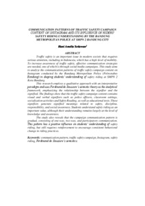 Amelia Setiawan, Hani (2026) COMMUNICATION PATTERNS OF TRAFFIC SAFETY CAMPAIGN CONTENT ON INSTAGRAM AND ITS INFLUENCE ON RIDERS’ SAFETY RIDING UNDERSTANDING BY THE BANDUNG METROPOLITAN POLICE AT SMPN 2 BANDUNG CITY. Thesis(S2) thesis, UNIVERSITAS PASUNDAN.