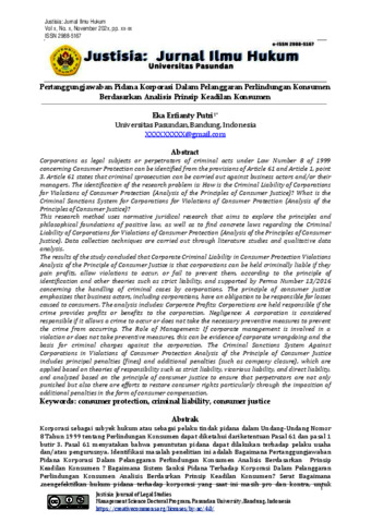 Korporasi sebagai subyek hukum atau sebagai pelaku tindak pidana dalam Undang-Undang Nomor 8 Tahun 1999 tentang Perlindungan Konsumen dapat diketahui dariketentuan Pasal 61 dan pasal 1 butir 3. Pasal 61 menyatakan bahwa penuntutan pidana dapat dilakukan terhadap pelaku usaha dan/atau pengurusnya. Identifikasi masalah penelitian ini adalah Bagaimana Pertanggungjawaban Pidana Korporasi Dalam Pelanggaran Perlindungan Konsumen Analisis Berdasarkan Prinsip Keadilan Konsumen ? Bagaimana Sistem Sanksi Pidana Terhadap Korporasi Dalam Pelanggaran Perlindungan Konsumen Analisis Berdasrkan Prinsip Keadilan Konsumen? Serat Bagaimana .mengefektifkan hukum pidana terhadap korporasi yang saat ini masih pro dan kontra, untuk Justisia: Jurnal Ilmu Hukum Vol x, No. x, November 202x, pp. xx-xx ISSN 2988-5167 2 Justisia: Journal of Legal Studies Management Science Doctoral Program, Pasundan University, Bandung, Indonesia https://creativecommons.org/licenses/by-nc/4.0/ memberikan perlindungan terhadap konsumen? Metode penelitian ini menggunakan penelitian yuridis normatif yang bertujuan untuk mencari asas-asas dan dasar-dasar falsafah hukum positif, serta menemukan hukum secara in-concreto mengenai Pertanggungjawaban Pidana Korporasi Dalam Pelanggaran Perlindungan Konsumen Analisis Prinsip Keadilan Konsumen. Teknik pengumpulan data dilakukan melalui studi kepustakaan, analisis data secara kualitatif. Hasil penelitian menyimpulkan bahwa Pertanggungjawaban Pidana Korporasi Dalam Pelanggaran Perlindungan Konsumen Analisis Prinsip Keadilan Konsumen adalah korporasi dapat dimintai pertanggungjawaban pidana jika memperoleh keuntungan, membiarkan pelanggaran terjadi, atau gagal mencegahnya, sesuai prinsip identifikasi dan teori lain seperti strict liability, serta didukung Perma Nomor 13/2016 tentang penanganan perkara tindak pidana oleh korporasi. Prinsip keadilan konsumen menekankan bahwa pelaku usaha, termasuk korporasi, memiliki kewajiban untuk bertanggung jawab atas kerugian yang ditimbulkan kepada konsumen. Analisisnya mencakup: Keuntungan Korporasi: Korporasi dimintai pertanggungjawaban apabila tindak pidana tersebut memberikan keuntungan atau manfaat bagi korporasi. Pembiaran: Korporasi dianggap bertanggung jawab jika membiarkan terjadinya tindak pidana atau tidak melakukan upaya pencegahan yang diperlukan untuk menghindari terjadinya tindak pidana. Peran Pengurus: Jika pengurus korporasi terlibat dalam pelanggaran atau tidak melakukan langkah-langkah pencegahan, hal ini dapat menjadi bukti kesalahan korporasi dan dasar tuntutan pidana terhadap korporasi. Sistem Sanksi Pidana Terhadap Korporasi Dalam Pelanggaran Perlindungan Konsumen Analisis Prinsip Keadilan Konsumen adalah meliputi pidana pokok (denda) dan pidana tambahan (seperti penutupan perusahaan), yang diterapkan berdasarkan teori pertanggungjawaban seperti strict liability, vicarious liability, dan direct liability, dan dianalisis berdasarkan prinsip keadilan konsumen untuk memastikan pelaku tidak hanya dihukum tetapi juga ada upaya pe