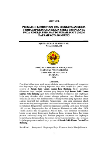 SEKAR PRAMESWARI, IQLIMA (2026) PENGARUH KOMPETENSI DAN LINGKUNGAN KERJA TERHADAP KEPUASAN KERJA SERTA DAMPAKNYA PADA KINERJA PERAWAT DI RUMAH SAKIT UMUM DAERAH KOTA BANDUNG. Thesis(S2) thesis, UNIVERSITAS PASUNDAN.