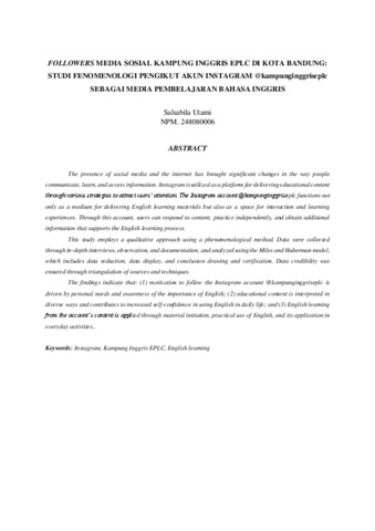 Utami, Salsabila (2026) OLLOWERS MEDIA SOSIAL KAMPUNG INGGRIS EPLC DI KOTA BANDUNG: STUDI FENOMENOLOGI PENGIKUT AKUN INSTAGRAM @kampunginggriseplc SEBAGAI MEDIA PEMBELAJARAN BAHASA INGGRIS. Thesis(S2) thesis, UNIVERSITAS PASUNDAN.