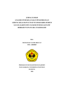 TAUFIK HIDAYAT, MOCHAMAD (2026) ANALISIS STUDI KELAYAKAN PENGEMBANGAN GEDUNG KELAS RAWAT INAP STANDAR (KRIS) DI RSUD SAYANG KABUPATEN CIANJUR STUDI KUALITATIF BERBASIS WAWANCARA STAKEHOLDER. Thesis(S2) thesis, UNIVERSITAS PASUNDAN.