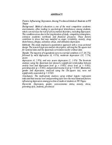 Faktor-faktor yang Memengaruhi Depresi pada Mahasiswa Preklinik FK Unpas Latar Belakang : Pendidikan kedokteran adalah salah satu bidang pendidikan dengan lingkungan paling kompetitif yang menimbulkan gangguan psikologis pada mahasiswa, yang dapat meningkatkan risiko gangguan mental serius, termasuk depresi. Hal ini karena durasi pendidikan yang panjang, lingkungan yang kompetitif, banyaknya materi yang harus dikuasai, kondisi finansial. Kondisi tersebut menimbulkan tekanan yang berujung pada kemarahan, iritabilitas, kecemasan, gangguan tidur, kelelahan, penyalahgunaan zat, hingga depresi Metode : Penelitian ini menggunakan data kuantitatif dengan desain cross sectional. Jenis penelitian yang digunakan adalah deskriptif analitik dengan uji chi- square untuk skala data nominal dan uji korelasi spearman untuk skala data ordinal. Hasil : mayoritas responden berada pada kondisi normal 117 (84,2%). depresi ringan sebanyak 6 (4,3%), depresi sedang sebanyak 10 (7,2%), depresi berat sebanyak 4 (2,9%), dan depresi sangat berat, yaitu 2 (1,4%). Uji bivariat menggunakan spearman menunjukkan terdapat hubungan yang signifikan antara tingkat kecemasan dengan tingkat depresi (p= <0.001), tingkat stress (p= <0.001), pola asuh orang tua (p= <0.001), tingkat pendapatan orang tua (p= 0.045). Sedangkan jenis kelamin dengan depresi menggunakan uji chi-square terbukti tidak berhubungan secara signifikan (p= 0.365). Kesimpulan : Hasil analisis multivariat regresi logistik ordinal, menunjukkan bahwa tingkat kecemasan dan pola asuh orang tua merupakan faktor paling dominan yang memengaruhi depresi pada mahasiswa preklinik FK Unpas. Kata Kunci : Depresi, jenis kelamin, status sosial ekonomi, kecemasan, stress, pola asuh orang tua, mahasiswa, preklinik