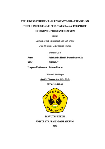 Orindianisa Hanifa Runandanatadila, Orindianisa Hanifa Runandanatadila (2026) PERLINDUNGAN HUKUM BAGI KONSUMEN AKIBAT PEMBELIAN TIKET KONSER MELALUI PERANTARA DALAM PERSPEKTIF HUKUM PERLINDUNGAN KONSUMEN. Skripsi(S1) thesis, FAKULTAS HUKUM UNIVERSITAS PASUNDAN.