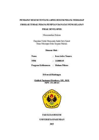 Ivan Ardra Tamera, Ivan Ardra Tamera (2025) PENDAPAT HUKUM TENTANG ASPEK HUKUM PIDANA TERHADAP INDIKASI TINDAK PIDANA PENIPUAN DAN/ATAU PENGGELAPAN PIHAK DEVELOPER. Skripsi(S1) thesis, FAKULTAS HUKUM UNIVERSITAS PASUNDAN.
