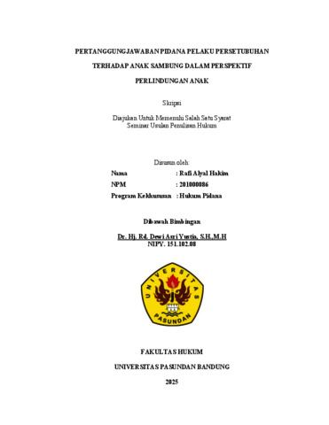 Rafi Alyal Hakim, Rafi Alyal Hakim (2025) PERTANGGUNGJAWABAN PIDANA PELAKU PERSETUBUHAN TERHADAP ANAK SAMBUNG DALAM PERSPEKTIF PERLINDUNGAN ANAK. Skripsi(S1) thesis, FAKULTAS HUKUM UNIVERSITAS PASUNDAN.