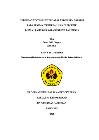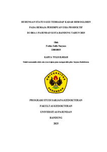 Fathia Zulfa Nusyura, Fathia Zulfa Nusyura (2026) HUBUNGAN STATUS GIZI TERHADAP KADAR HEMOGLOBIN PADA REMAJA PEREMPUAN USIA PRODUKTIF DI SMA 1 PASUNDAN KOTA BANDUNG TAHUN 2025. Skripsi(S1) thesis, UNIVERSITAS PASUNDAN.