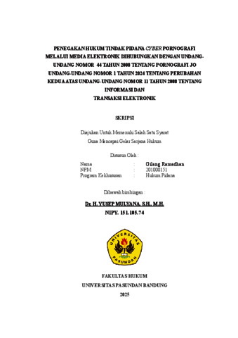 Gilang Ramadhan, Gilang Ramadhan (2025) PENEGAKAN HUKUM TINDAK PIDANA CYBER PORNOGRAFI MELALUI MEDIA ELEKTRONIK DIHUBUNGKAN DENGAN UNDANGUNDANG NOMOR 44 TAHUN 2008 TENTANG PORNOGRAFI JO UNDANG-UNDANG NOMOR 1 TAHUN 2024 TENTANG PERUBAHAN KEDUA ATAS UNDANG-UNDANG NOMOR 11 TAHUN 2008 TENTANG INFORMASI DAN TRANSAKSI ELEKTRONIK. Skripsi(S1) thesis, FAKULTAS HUKUM UNIVERSITAS PASUNDAN.