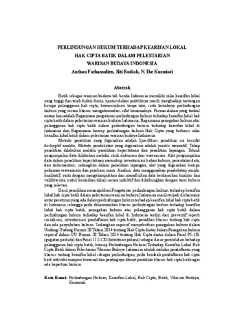 FATHANUDIEN, ANTHON (2026) PERLINDUNGAN HUKUM TERHADAP KEARIFAN LOKAL HAK CIPTA BATIK DALAM PELESTARIAN WARISAN BUDAYA INDONESIA. UNSPECIFIED thesis, UNIVERSITAS PASUNDAN.