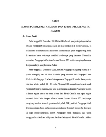 Penelitian ini mengkaji Putusan Pengadilan Nomor 93/PDT/2020/PT MTR yang membahas mengenai sengketa antara konsumen dan pihak hotel selaku pelaku usaha terkait dugaan pelanggaran hak konsumen dalam layanan jasa perhotelan. Fokus utama kajian adalah analisis mengenai perbedaan pertimbangan Majelis Hakim pada Pengadilan Negeri dan Majelis Hakim pada Pengadilan Tinggi dalam menilai legal standing yang dimiliki konsumen dalam mengajukan gugatan, terutama ketika konsumen bukan pihak yang secara langsung melakukan pemesanan kamar hotel. Penelitian ini menggunakan alat analisis interpretasi hukum, baik secara gramatikal maupun sistematis. Penafsiran gramatikal dilakukan terhadap unsur-unsur dalam Pasal 1365 dan 1366 KUHPerdata serta Pasal 1 angka 2 Undang-Undang Perlindungan Konsumen untuk menegaskan kedudukan konsumen sebagai pihak yang memperoleh manfaat langsung dari jasa perhotelan. Sementara itu, penafsiran sistematis digunakan dengan mengaitkan ketentuan perlindungan konsumen dalam Undang-Undang Nomor 8 Tahun 1999 dengan norma-norma dalam UUD 1945, Kitab Undang-Undang Hukum Perdata serta Peraturan Menteri Pariwisata mengenai standar usaha hotel. Hasil penelitian menunjukkan bahwa berdasarkan Pasal 1 angka 2 Undang- Undang Perlindungan Konsumen, konsumen akhir adalah pemakai langsung barang atau jasa. Sehingga Penggugat dapat dipandang sebagai konsumen akhir yang berhak atas perlindungan hak-haknya sesuai Pasal 4 Undang-Undang tersebut. Selain itu, tindakan hotel yang tidak memberikan solusi dan alternatif akomodasi lain melanggar standar pelayanan hotel dan Pasal 1366 KUHPerdata. Sehingga konsumen dapat dinilai memiliki legal standing berdasarkan pada penggunaan kamar hotel dan sebagai pihak yang mengalami kerugian secara langsung. Penelitian ini menegaskan pentingnya peranan hakim dalam menafsirkan hukum secara progresif dengan lebih mengedepankan prinsip perlindungan konsumen. Kata kunci: Perlindungan Konsumen, Legal Standing, Jasa Perhotelan, Perbuatan Melawan Hukum, UUPK.