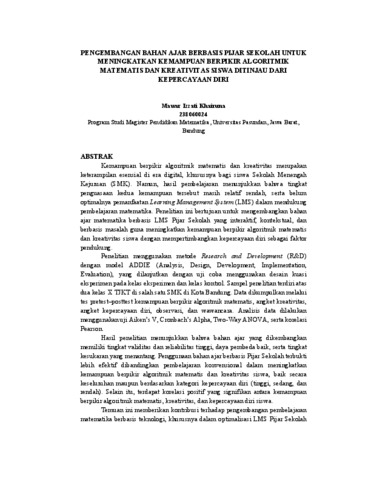 Izzati Khairuna, Mawar (2026) PENGEMBANGAN BAHAN AJAR BERBASIS PIJAR SEKOLAH UNTUK MENINGKATKAN KEMAMPUAN BERPIKIR ALGORITMIK MATEMATIS DAN KREATIVITAS SISWA DITINJAU DARI KEPERCAYAAN DIRI. Thesis(S2) thesis, UNIVERSITAS PASUNDAN.