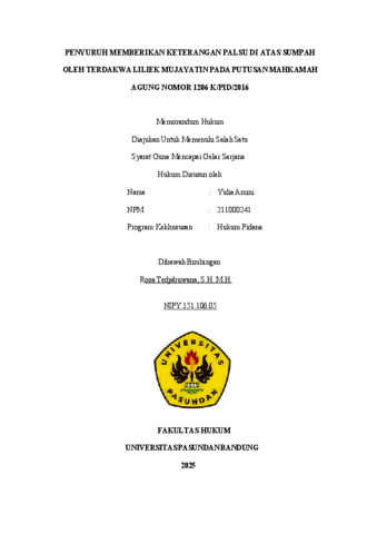 Yulia Amini, Yulia Amini (2025) PENYURUH MEMBERIKAN KETERANGAN PALSU DI ATAS SUMPAH OLEH TERDAKWA LILIEK MUJAYATIN PADA PUTUSAN MAHKAMAH AGUNG NOMOR 1206 K/PID/2016. Skripsi(S1) thesis, FAKULTAS HUKUM UNIVERSITAS PASUNDAN.