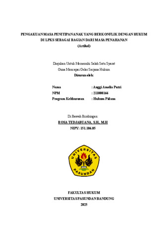 Anggi Amelia Putri, Anggi Amelia Putri (2025) PENGAKUAN MASA PENITIPAN ANAK YANG BERKONFLIK DENGAN HUKUM DI LPKS SEBAGAI BAGIAN DARI MASA PENAHANAN. Skripsi(S1) thesis, FAKULTAS HUKUM UNIVERSITAS PASUNDAN.