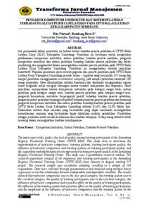Inti permasalah dalam penelitian ini bahwa belum kualitas peserta pelatihan di UPTD Balai Latihan Kerja (BLK) Kabupaten Sumedang. Penelitian ini bertujuan untuk mengetahui pelaksanaan kompetensi instruktur, sistem pelatihan, kualitas peserta peatihan, pengaruh kompetensi instruktur dan sistem pelatihan terhadap kualitas peserta pelatihan dan faktor pendukung dan penghambat dalam meningkatkan kualitas peserta pelatihan pada UPTD Balai Latihan Kerja Kabupaten Sumedang. Penelitian ini menggunakan metode penelitian kuantitatif. Populasi penelitian yaitu seluruh pegawai dan peserta pelatihan pada UPTD Balai Latihan Kerja Kabupaten Sumedang periode Jauari – Agustus yang berjumlah 357 orang dan sampel penelitian menggunakan accindential sampling, jadi sampel penelitian sebanyak 189 orang responden. Data dikumpulkan melalui kuesioner dan dianalisis menggunakan regresi linear berganda untuk menguji hubungan antara variabel independen dan dependen. Hasil penelitian menunjukkan bahwa kompetensi instruktur pada kategori sangat baik, sistem pelatihan pada kategori sangat baik, kualitas peserta pelatihan pada kategori sangat baik, pengaruh kompetensi instruktur berpengaruh positif terhadap kualitas peserta pelatihan, pengaruh sistem pelatihan berpengaruh positif terhadap kualitas peserta pelatihan dan besarnya pengaruh kompetensi instruktur dan sistem pelatihan terhadap kualitas peserta pelatihan pada UPTD Balai Latihan Kerja Kabupaten Sumedang sebesar 81,6% dan 18,4% faktor lain. Disarankan sumber daya manusia yang berkualitas yang dapat membantu meningkatkan kesejahteraan manusia yang berkualitas dapat dilakukan melalui pendidikan. Pendidikan sebagai jembatan untuk meraih kesuksesan dan kualitas hidupnya. Setiap orang dituntut untuk bersaing dalam meningkatkan kualitas kehidupannya.