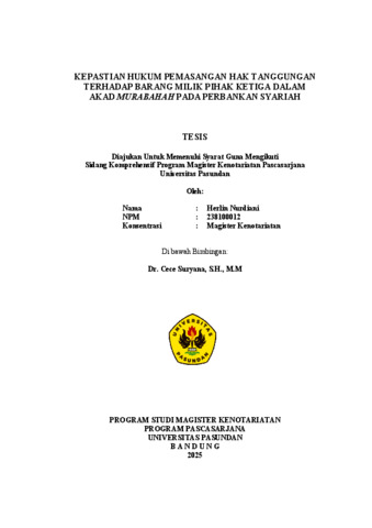 Nurdiani, Herlin (2026) KEPASTIAN HUKUM PEMASANGAN HAK TANGGUNGAN TERHADAP BARANG MILIK PIHAK KETIGA DALAM AKAD MURABAHAH PADA PERBANKAN SYARIAH. Thesis(S2) thesis, UNIVERSITAS PASUNDAN.