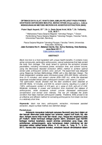 Septi Asyanti,, Puter (2026) OPTIMASI DAYA ALAT, WAKTU DAN JUMLAH PELARUT PADA PROSES EKSTRAKSI ANTOSIANIN BEKATUL BERAS HITAM (Oryza sativa L. indica) MENGGUNAKAN METODE MICROWAVE ASSISTED EXTRACTION (MAE). Thesis(S2) thesis, UNIVERSITAS PASUNDAN.