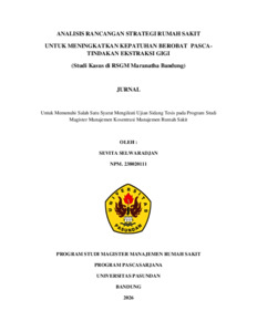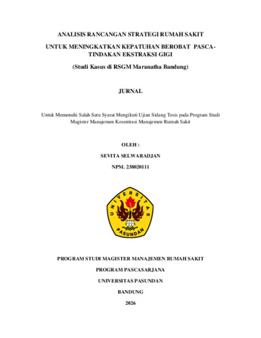 SELWARADJAN, SEVITA (2026) ANALISIS RANCANGAN STRATEGI RUMAH SAKIT UNTUK MENINGKATKAN KEPATUHAN BEROBAT PASCA- TINDAKAN EKSTRAKSI GIGI (Studi Kasus di RSGM Maranatha Bandung). Thesis(S2) thesis, UNIVERSITAS PASUNDAN.