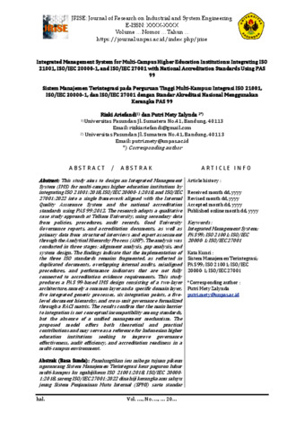 Ariefandi, Rizki (2026) Sistem Manajemen Terintegrasi pada Perguruan Tinggi Multi-Kampus: Integrasi ISO 21001, ISO/IEC 20000-1, dan ISO/IEC 27001 dengan Standar Akreditasi Nasional Menggunakan Kerangka PAS 99. Thesis(S2) thesis, UNIVERSITAS PASUNDAN.