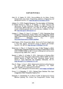 ABSTRAK Penelitian ini membahas penerapan Vogel’s Approximation Method (VAM) dan metode Stepping Stone untuk meminimalisasi biaya distribusi susu segar di Koperasi Peternak Sapi Bandung Utara (KPSBU) Lembang. Penelitian dilakukan dengan menganalisis sistem distribusi aktual koperasi, kemudian membandingkannya dengan hasil perhitungan metode optimasi matematis. Data diperoleh melalui observasi lapangan, wawancara, dan dokumen internal perusahaan. Hasil perhitungan menunjukkan bahwa biaya distribusi aktual tahun 2024 sebesar Rp 3.815.638.144. Penerapan VAM menghasilkan solusi awal dengan biaya distribusi sebesar Rp 7.778.300 per hari, atau setara Rp 2.838.094.500 per tahun. Uji optimalitas menggunakan Stepping Stone menunjukkan hasil biaya yang sama, sehingga solusi awal VAM dinyatakan optimal. Perbandingan hasil memperlihatkan adanya potensi efisiensi sebesar Rp 977.543.644 per tahun apabila perusahaan mengadopsi metode ini. Penelitian ini menyimpulkan bahwa integrasi metode VAM dan Stepping Stone mampu meningkatkan efisiensi distribusi, memaksimalkan pemanfaatan kapasitas unit pendingin, serta memberikan dasar perencanaan logistik yang lebih sistematis dan terukur bagi KPSBU Lembang. Kata Kunci: Vogel’s Approximation Method (VAM), Metode Stepping Stone, Optimalisasi distribusi, Biaya distribusi, KPSBU Lembang, Riset operasi, Manajemen operasi, Efisiensi logistik.