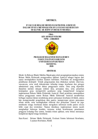 AHMAD NUROBI, ADI (2026) EVALUASI REKAM MEDIS ELEKTRONIK ASSIST.ID DALAM UPAYA MENINGKATKAN LAYANAN KESEHATAN DI KLINIK AR-RIDWAN BHAKTI MEDIKA. Thesis(S2) thesis, UNIVERSITAS PASUNDAN.