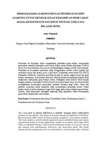 Nurjanah, Anisa (2026) PROBLEM BASED LEARNING DENGAN PENDEKATAN DEEP LEARNING UNTUK MENINGKATKAN KEMAMPUAN PEMECAHAN MASALAH MATEMATIS DAN MINAT DITINJAU DARI GAYA BELAJAR SISWA. Thesis(S2) thesis, UNIVERSITAS PASUNDAN.