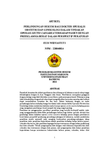 WIDYASTUTI, EUIS (2026) PERLINDUNGAN HUKUM BAGI DOKTER SPESIALIS OBSTETRI DAN GINEKOLOGI DALAM TINDAKAN OPERASI SECTIO CAESAREA TERHADAP PASIEN DENGAN PREEKLAMSIA BERAT DALAM PERSPEKTIF PERATURAN. Thesis(S2) thesis, UNIVERSITAS PASUNDAN.
