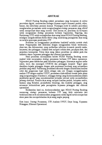 NOAH Printing Bandung adalah perusahaan yang beroperasi di sektor percetakan digital, menawarkan berbagai layanan seperti kemasan produk, stiker, banner, dan kebutuhan promosi lainnya. Persaingan ketat di industri percetakan mengharuskan perusahaan untuk mengembangkan strategi pemasaran yang efektif untuk memperkuat daya saing mereka. Oleh karena itu, penelitian ini bertujuan untuk menganalisis strategi pemasaran berbasis Segmentasi, Targeting, dan Positioning (STP) untuk meningkatkan daya saing bisnis NOAH Printing Bandung, sekaligus mengidentifikasi faktor-faktor yang mendukung peningkatan daya saing ini melalui penerapan pendekatan STP. Penelitian ini menggunakan pendekatan kualitatif melalui metode studi kasus. Pengumpulan data dilakukan dengan menggunakan teknik wawancara, observasi, dan dokumentasi, yang melibatkan informan termasuk pemilik usaha, karyawan, dan pelanggan. Analisis data meliputi reduksi data, penyajian data, dan penarikan kesimpulan. Fokus daya saing dalam penelitian ini adalah pada dua indikator utama: kepuasan pelanggan dan efisiensi operasional. Hasil penelitian menunjukkan bahwa NOAH Printing Bandung secara implisit telah menerapkan strategi pemasaran berbasis STP dalam operasinya. Segmentasi pasar didasarkan pada kebutuhan pelanggan, khususnya segmen usaha mikro, kecil, dan menengah (UMKM) dan pelanggan korporat. Target pasar diarahkan kepada pelanggan dengan pola pemesanan berulang yang memastikan produksi yang stabil. Positioning perusahaan dibentuk dengan menekankan kualitas cetak dan pengiriman tepat waktu sebagai nilai inti. Dengan menggabungkan analisis STP dengan analisis SWOT, perusahaan diidentifikasi berada pada posisi yang menguntungkan (Kuadran I), sehingga strategi yang direkomendasikan adalah pendekatan agresif yang memaksimalkan kekuatan internal untuk memanfaatkan peluang eksternal. Penentu daya saing meliputi kualitas produk, ketepatan waktu, layanan yang fleksibel, pemanfaatan teknologi, dan loyalitas pelanggan, yang semuanya berkontribusi pada peningkatan kepuasan pelanggan dan efisiensi operasional. Berdasarkan hasil ini, direkomendasikan agar NOAH Printing Bandung merancang strategi pemasaran berbasis STP yang lebih sistematis dan terdokumentasi serta memaksimalkan penggunaan media digital untuk memperluas akses pasar dan mempertahankan daya saing jangka panjang. Kata kunci: Strategi Pemasaran, STP, Analisis SWOT, Daya Saing, Kepuasan Pelanggan, Efisiensi Operasional.