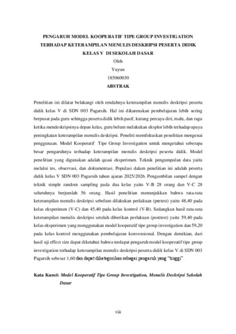 Yuyun, 185060030 (2026) PENGARUH MODEL KOOPERATIF TIPE GROUP INVESTIGATION TERHADAP KETERAMPILAN MENULIS DESKRIPSI PESERTA DIDIK KELAS V DI SEKOLAH DASAR (Penelitian Quasi Eksperimen Kelas IV Sekolah Dasar Negeri 003 Pagarsi Tahun Ajaran 2025/2026). Skripsi(S1) thesis, FKIP UNPAS.