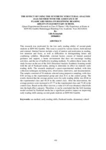 Penelitian ini dilatar belakangi oleh rendahnya kemampuan membaca permulaan peserta didik kelas II SDN 042 Gambir. Hal ini dikarenakan pembelajaran lebih sering berpusat pada guru dan penyebab lainnya juga berasal dari dalam diri peserta didik (internal) maupun dari lingkungan sekitar (eksternal). Faktor internal meliputi kurangnya minat dan motivasi membaca, kurangnya perhatian dan fokus, serta kesulitan dalam membedakan huruf dan merangkai suku kata. Sementara faktor eksternal bisa berupa kurangnya bimbingan dan dukungan dari orang tua, lingkungan keluarga yang kurang mendukung kegiatan membaca, dan metode pembelajaran yang kurang tepat. Peneliti memfokuskan penelitian mengenai penggunaan model SAS (Struktural Analitik Sintetik) untuk mengetahui seberapa besar pengaruhnya terhadap kemampuan membaca permulaan peserta didik. Metode penelitian yang digunakan adalah quasi eksperiment. Teknik pengumpulan data yaitu melalui tes, observasi, wawancara, dan dokumentasi. Pengambilan sampel dengan teknik purposive sampling sebanyak 54 dari jumlah dua kelas, yaitu kelas II-B sebagai kelas eksperimen dan kelas II-A sebagai kelas kontrol. Hasil penelitian menunjukan bahwa rata-rata kemampuan membaca permulaan sebelum dilakukan perlakuan (pretest) yaitu 49,66 pada kelas eksperimen (II-B) dan 44,18 pada kelas kontrol (II-A). Sedangkan hasil rata-rata kemampuan membaca permulaan setelah diberi perlakuan (postest) yaitu 87,77 pada kelas eksperimen dan 44,18 yang menggunakan metode SAS dengan berbantuan media kartu flashcard dan 75,48 pada kelas kontrol yang menggunakan pembelajaran konvensional. Dengan demikian, dari hasil uji effect size dapat diketahui bahwa terdapat pengaruh metode SAS dengan berbantuan media kartu flashcard terhadap peserta didik kelas II di SDN 042 Gambir sebesar 4,45 dan dapat dikategorikan sebagai pengaruh yang “tinggi” dibandingan dengan kelas kontrol dengan pembelajaran konvensional. Kata Kunci: metode sas, kemampuan membaca permulaan, media kartu flashcard sekolah dasar