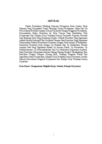 ABSTRAK Dalam Perusahaan Dibidang Koperasi Petingnnya Peran Sumber Daya Manusia Yang Kompatibel Untuk Mencapai Tujuan Perusahaan. Maka Dari Itu Perlu Adanya Evaluasi Capaian Kinerja Karyawan Sebagai Penggerak Perusahaan. Permasalahan Dalam Penelitian Ini Yaitu Kinerja Yang Disebabkan Oleh Kompensasi Dan Disiplin Kerja Terhadap Kinerja Karyawan Koperasi Peternak Sapi Bandung Utara Yang Dimoderasi Gender. Metode Penelitian Yang Digunakan Adalah Metode Deskriptif Dan Verifikatif Dimana Data Penelitian Yang Digunakan Dikumpulkan Melalui Penyebaran Kuesioner Dengan Total Sampel 59 Responden. Instrument Penelitian Diuji Dengan Uji Validitas Dan Uji Reliabilitas. Metode Analisis Data Yang Digunakan Adalah Uji Asumsi Klasik, Uji Normalitas, Uji Multikolineritas, Uji Heteroskedasitas Dan Uji Moderation Regression Analysis. Hasil Penelitian Menunjukan Bahwa Masing-Masing Variabel Mendapatkan Skor Rata-Rata Dengan Kategori Kurang Baik. Terdapat Pengaruh Positif Dan Signifikan Antara Kompensasi, Disiplin Kerja Terhadap Kinerja Karyawan, Gender Mampu Memoderasi Pengaruh Kompensasi Dan Disiplin Kerja Terhadap Kinerja Karyawan. Kata Kunci : Kompensasi, Disiplin Kerja, Gender, Kinerja Karyawan