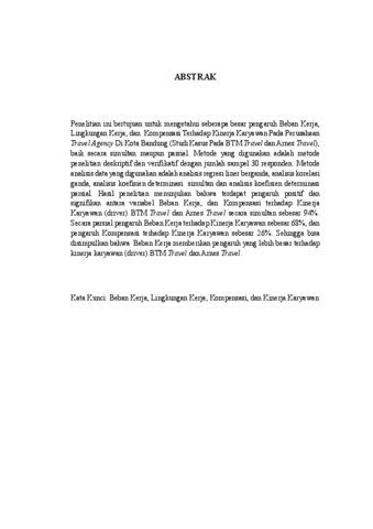 Penelitian ini bertujuan untuk mengetahui seberapa besar pengaruh Beban Kerja, Lingkungan Kerja, dan Kompensasi Terhadap Kinerja Karyawan Pada Perusahaan Travel Agency Di Kota Bandung (Studi Kasus Pada BTM Travel dan Arnes Travel), baik secara simultan maupun parsial. Metode yang digunakan adalah metode penelitian deskriptif dan verifikatif dengan jumlah sampel 30 responden. Metode analisis data yang digunakan adalah analisis regresi liner berganda, analisis korelasi ganda, analisis koefisien determinasi simultan dan analisis koefisien determinasi parsial. Hasil penelitian menunjukan bahwa terdapat pengaruh positif dan signifikan antara variabel Beban Kerja, dan Kompensasi terhadap Kinerja Karyawan (driver) BTM Travel dan Arnes Travel secara simultan sebesar 94%. Secara parsial pengaruh Beban Kerja terhadap Kinerja Karyawan sebesar 68%, dan pengaruh Kompensasi terhadap Kinerja Karyawan sebesar 26%. Sehingga bisa disimpulkan bahwa Beban Kerja memberikan pengaruh yang lebih besar terhadap kinerja karyawan (driver) BTM Travel dan Arnes Travel. Kata Kunci: Beban Kerja, Lingkungan Kerja, Kompensasi, dan Kinerja Karyawan