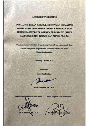 Dr. Hj. Mujibah A Sufyani, SE.,MM, Pembimbing II (2026) PENGARUH BEBAN KERJA, LINGKUNGAN KERJA DAN KOMPENSASI TERHADAP KINERJA KARYAWAN PADA PERUSAHAAN TRAVEL AGENCY DI BANDUNG (STUDI KASUS PADA BTM TRAVEL DAN ARNES TRAVEL). Skripsi(S1) thesis, Universitas Pasundan.