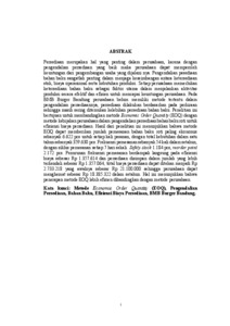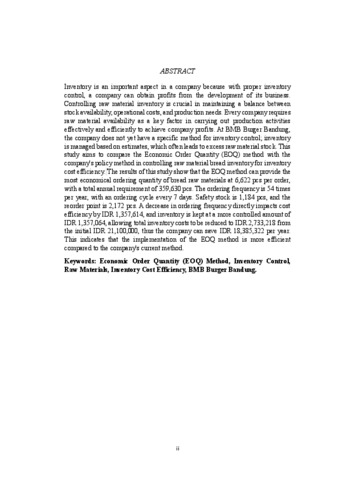 ABSTRAK Persediaan merupakan hal yang penting dalam perusahaan, karena dengan pengendalian persediaan yang baik maka perusahaan dapat memperoleh keuntungan dari pengembangan usaha yang dijalani nya. Pengendalian pesediaan bahan baku sangatlah penting dalam menjaga keseimbangan antara ketersediaan stok, biaya operasional serta kebutuhan produksi. Setiap perusahaan memerlukan ketersediaan bahan baku sebagai faktor utama dalam menjalankan aktivitas produksi secara efektif dan efisien untuk mencapai keuntungan perusahaan. Pada BMB Burger Bandung perusahaan belum memiliki metode tertentu dalam pengendalian persediaannya, persediaan dilakukan berdasarkan pada perkiraan sehingga masih sering ditemukan kelebihan persediaan bahan baku. Penelitian ini bertujuan untuk membandingkan metode Economic Order Quantity (EOQ) dengan metode kebijakan perusahaan dalam pengendalian persediaan bahan baku roti untuk efisiensi biaya persediaan. Hasil dari penelitian ini menunjukkan bahwa metode EOQ dapat memberikan jumlah pemesanan bahan baku roti paling ekonomis sebanyak 6.622 pcs untuk setiap kali pesanan, dengan total kebutuhan dalam satu tahun sebanyak 359.630 pcs. Frekuensi pemesanan sebanyak 54 kali dalam setahun, dengan siklus pemesanan setiap 7 hari sekali. Safety stock 1.184 pcs, reorder point 2.172 pcs. Penurunan frekuensi pemesanan berdampak langsung pada efisiensi biaya sebesar Rp 1.357.614 dan persediaan disimpan dalam jumlah yang lebih terkendali sebesar Rp 1.357.064, total biaya persediaan dapat ditekan menjadi Rp 2.733.218 yang awalnya sebesar Rp 21.100.000 sehingga perusahaan dapat menghemat sebesar Rp 18.385.322 dalam setahun. Hal ini menunjukkan bahwa penerapan metode EOQ lebih efisien dibandingkan dengan metode perusahaan. Kata kunci: Metode Economic Order Quantity (EOQ), Pengendalian Persediaan, Bahan Baku, Efisiensi Biaya Persediaan, BMB Burger Bandung.