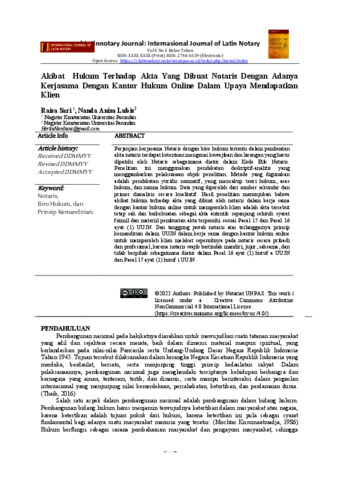 Perjanjian kerjasama Notaris dengan biro hukum tertentu dalam pembuatan akta notaris terdapat ketentuan mengenai kewajiban dan larangan yang harus dipatuhi oleh Notaris sebagaimana diatur dalam Kode Etik Notaris. Berdasarkan uraian tersebut, peneliti bertujuan untuk mempelajari, memahami, dan menganalisis akibat hukum terhadap akta yang dibuat notaris dengan adanya kerjasama dengan kantor hukum online dalam upaya mendapatkan klien serta tanggung jawab notaris atas terlanggarnya prinsip kemandirian dalam UUJN dalam bekerjasama dengan kantor hukum online untuk mendapatkan klien. Penelitian ini bersifat deskriptif-analitis, yaitu dengan membuat gambaran-gambaran secara sistematis mengenai permasalahan yang hendak dianalisis. Metode pendekatan yang penulis lakukan dalam meneliti dan mengkaji permasalahan yang ada dalam penelitian ini menggunakan pendekatan yuridis normatif. Adapun tahapan penelitiannya adalah penelitian kepustakaan dan lapangan. Metode analisis data yang dipergunakan dalam penelitian ini adalah yuridis-kualitatif, yaitu data yang diperoleh melalui penelitian kepustakaan disusun secara sistematis dan selanjutnya dianalisis secara kualitatif untuk mencapai kejelasan masalah yang akan dibahas. Hasil penelitian menunjukkan bahwa akibat hukum terhadap akta yang dibuat oleh notaris dalam kerja sama dengan kantor hukum online untuk memperoleh klien adalah akta tersebut tetap sah dan berkekuatan sebagai akta autentik sepanjang seluruh syarat formil dan materiil pembuatan akta terpenuhi sesuai Pasal 15 dan Pasal 16 ayat (1) UUJN. Dan tanggung jawab notaris atas terlanggarnya prinsip kemandirian dalam UUJN dalam kerja sama dengan kantor hukum online untuk memperoleh klien melekat sepenuhnya pada notaris secara pribadi dan profesional, karena notaris wajib bertindak mandiri, jujur, saksama, dan tidak berpihak sebagaimana diatur dalam Pasal 16 ayat (1) huruf a UUJN dan Pasal 17 ayat (1) huruf i UUJN.