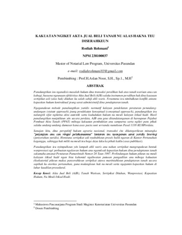 Rohmani, Rodiah (2026) KEKUATAN MENGIKAT AKTA JUAL BELI TANAH YANG ALAS HAKNYA TIDAK DISERAHKAN. Thesis(S2) thesis, UNIVERSITAS PASUNDAN.