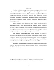 Penelitian ini di latarbelakangi oleh pesatnya perkembangan pemasaran digital melalui media sosial, khususnya TikTok, yang dimanfaatkan oleh pelaku usaha untuk meningkatkan keterlibatan konsumen. Salah satu strategi yang banyak digunakan adalah content marketing dan influencer marketing untuk membangun customer engagement. Penelitian ini bertujuan untuk menganalisis pengaruh content marketing dan influencer marketing terhadap customer engagement pada akun TikTok @bandungcheesecuit. Metode penelitian yang digunakan adalah metode kuantitatif dengan pendekatan deskriptif. Teknik pengumpulan data dilakukan melalui penyebaran kuesioner kepada 100 responden yang merupakan calon konsumen dan konsumen Bandung Cheesecuit, kemudian dianalisis menggunakan analisis jalur (path analysis) serta pengujian hipotesis untuk mengetahui pengaruh antar variabel. Hasil penelitian menunjukkan bahwa content marketing dan influencer marketing berada pada kategori baik serta memiliki pengaruh positif terhadap customer engagement. Konten yang informatif, menarik, dan relevan mampu meningkatkan interaksi audiens, sedangkan kolaborasi dengan influencer yang kredibel dapat memperkuat kepercayaan dan ketertarikan konsumen terhadap produk. Berdasarkan hasil penelitian tersebut, penerapan strategi content marketing dan influencer marketing secara efektif dapat meningkatkan customer engagement pada akun TikTok @bandungcheesecuit. Kata Kunci: Content Marketing, Influencer Marketing, Customer Engagement