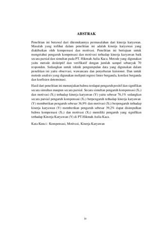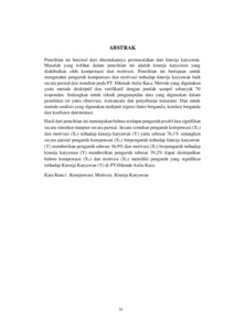 ABSTRAK Penelitian ini berawal dari ditemukannya permasalahan dari kinerja karyawan. Masalah yang terlihat dalam penelitian ini adalah kinerja karyawan yang diakibatkan oleh kompensasi dan motivasi. Penelitian ini bertujuan untuk mengetahui pengaruh kompensasi dan motivasi terhadap kinerja karyawan baik secara parsial dan simultan pada PT. Hikmah Aulia Kaca. Metode yang digunakan yaitu metode deskriptif dan verifikatif dengan jumlah sampel sebanyak 70 responden. Sedangkan untuk teknik pengumpulan data yang digunakan dalam penelitian ini yaitu observasi, wawancara dan penyebaran kuisioner. Dan untuk metode analisis yang digunakan meliputi regresi linier berganda, korelasi berganda dan koefisien determinasi. Hasil dari penelitian ini menunjukan bahwa terdapat pengaruh positif dan signifikan secara simultan maupun secara parsial. Secara simultan pengaruh kompensasi (X1) dan motivasi (X2) terhadap kinerja karyawan (Y) yaitu sebesar 76,1% sedangkan secara parsial pengaruh kompensasi (X1) berpengaruh terhadap kinerja karyawan (Y) memberikan pengaruh sebesar 36,9% dan motivasi (X2) berpengaruh terhadap kinerja karyawan (Y) memberikan pengaruh sebesar 39,2% dapat disimpulkan bahwa kompensasi (X1) dan motivasi (X2) memiliki pengaruh yang signifikan terhadap Kinerja Karyawan (Y) di PT.Hikmah Aulia Kaca. Kata Kunci : Kompensasi, Motivasi, Kinerja Karyawan
