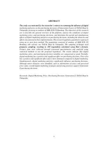 Hamonangan, Daniel Satrio (2026) PENGARUH DIGITAL MARKETING DAN HARGA TERHADAP KEPUTUSAN PEMBELIAN GENERASI Z PENGGUNA TIKTOK SHOP BY TOKOPEDIA (KASUS SISWA SISWI SMK ICB CN BANDUNG). Skripsi(S1) thesis, FISIP UNPAS.