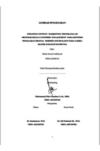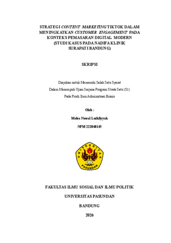 Luthfiyyah, Melsa Nawal (2026) STRATEGI CONTENT MARKETING TIKTOK DALAM MENINGKATKAN CUSTOMER ENGAGEMENT PADA KONTEKS PEMASARAN DIGITAL MODERN (STUDI KASUS PADA NADIFA KLINIK SURAPATI BANDUNG). Skripsi(S1) thesis, FISIP UNPAS.