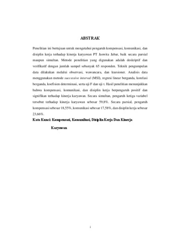 ABSTRAK Penelitian ini bertujuan untuk mengetahui pengaruh kompensasi, komunikasi, dan disiplin kerja terhadap kinerja karyawan PT Jaswita Jabar, baik secara parsial maupun simultan. Metode penelitian yang digunakan adalah deskriptif dan verifikatif dengan jumlah sampel sebanyak 65 responden. Teknik pengumpulan data dilakukan melalui observasi, wawancara, dan kuesioner. Analisis data menggunakan metode successive interval (MSI), regresi linear berganda, korelasi berganda, koefisien determinasi, serta uji F dan uji t. Hasil penelitian menunjukkan bahwa kompensasi, komunikasi, dan disiplin kerja berpengaruh positif dan signifikan terhadap kinerja karyawan. Secara simultan, pengaruh ketiga variabel tersebut terhadap kinerja karyawan sebesar 59,8%. Secara parsial, pengaruh kompensasi sebesar 18,55%, komunikasi sebesar 17,58%, dan disiplin kerja sebesar 23,66%. Kata Kunci: Kompensasi, Komunikasi, Disiplin Kerja Dan Kinerja Karyawan