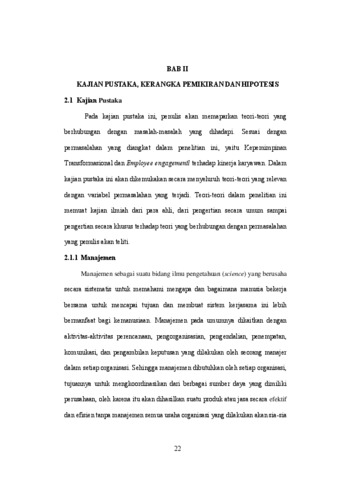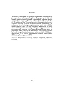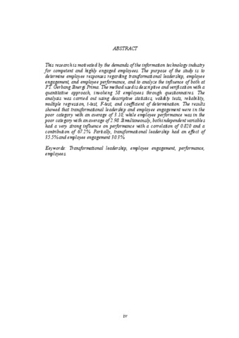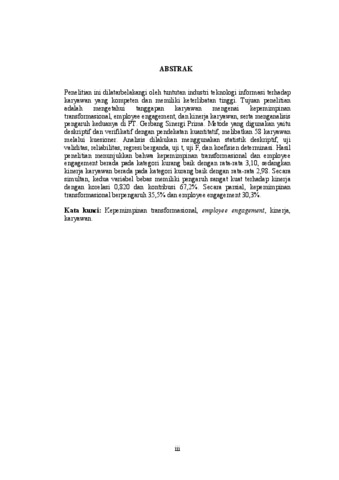 ABSTRAK Penelitian ini dilatarbelakangi oleh tuntutan industri teknologi informasi terhadap karyawan yang kompeten dan memiliki keterlibatan tinggi. Tujuan penelitian adalah mengetahui tanggapan karyawan mengenai kepemimpinan transformasional, employee engagement, dan kinerja karyawan, serta menganalisis pengaruh keduanya di PT. Gerbang Sinergi Prima. Metode yang digunakan yaitu deskriptif dan verifikatif dengan pendekatan kuantitatif, melibatkan 58 karyawan melalui kuesioner. Analisis dilakukan menggunakan statistik deskriptif, uji validitas, reliabilitas, regresi berganda, uji t, uji F, dan koefisien determinasi. Hasil penelitian menunjukkan bahwa kepemimpinan transformasional dan employee engagement berada pada kategori kurang baik dengan rata-rata 3,10, sedangkan kinerja karyawan berada pada kategori kurang baik dengan rata-rata 2,98. Secara simultan, kedua variabel bebas memiliki pengaruh sangat kuat terhadap kinerja dengan korelasi 0,820 dan kontribusi 67,2%. Secara parsial, kepemimpinan transformasional berpengaruh 35,5% dan employee engagement 30,3%. Kata kunci: Kepemimpinan transformasional, employee engagement, kinerja, karyawan