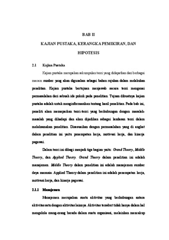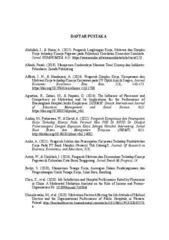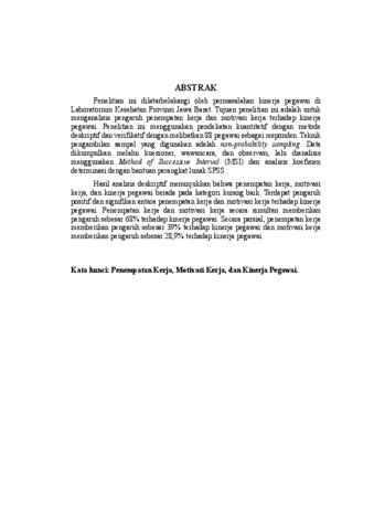 BSTRAK Penelitian ini dilatarbelakangi oleh permasalahan kinerja pegawai di Laboratorium Kesehatan Provinsi Jawa Barat. Tujuan penelitian ini adalah untuk menganalisis pengaruh penempatan kerja dan motivasi kerja terhadap kinerja pegawai. Penelitian ini menggunakan pendekatan kuantitatif dengan metode deskriptif dan verifikatif dengan melibatkan 88 pegawai sebagai responden. Teknik pengambilan sampel yang digunakan adalah non-probability sampling. Data dikumpulkan melalui kuesioner, wawancara, dan observasi, lalu dianalisis menggunakan Method of Successive Interval (MSI) dan analisis koefisien determinasi dengan bantuan perangkat lunak SPSS. Hasil analisis deskriptif menunjukkan bahwa penempatan kerja, motivasi kerja, dan kinerja pegawai berada pada kategori kurang baik. Terdapat pengaruh positif dan signifikan antara penempatan kerja dan motivasi kerja terhadap kinerja pegawai. Penempatan kerja dan motivasi kerja secara simultan memberikan pengaruh sebesar 68% terhadap kinerja pegawai. Secara parsial, penempatan kerja memberikan pengaruh sebesar 39% terhadap kinerja pegawai dan motivasi kerja memberikan pengaruh sebesar 28,9% terhadap kinerja pegawai. Kata kunci: Penempatan Kerja, Motivasi Kerja, dan Kinerja Pegawa