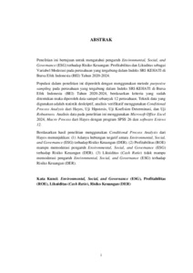 ABSTRAK Penelitian ini bertujuan untuk mengatahui pengaruh Environmental, Social, and Governance (ESG) terhadap Risiko Keuangan: Profitabilitas dan Likuditas sebagai Variabel Moderasi pada perusahaan yang tergabung dalam Indeks SRI-KEHATI di Bursa Efek Indonesia (BEI) Tahun 2020-2024. Populasi dalam penelitian ini diperoleh dengan menggunakan metode purposive sampling pada perusahaan yang tergabung dalam Indeks SRI-KEHATI di Bursa Efek Indonesia (BEI) Tahun 2020-2024, berdasarkan kriteria yang sudah ditentukan maka diperoleh data sampel sebanyak 12 perusahaan. Teknik data yang digunakan adalah statistik deskriptif, analisis verifikatif menggunakan Conditional Process Analysis dari Hayes, Uji Hipotesis, Uji Koefisien Determinasi, dan Uji Robustness. Analisis data pada penelitian ini menggunakan Microsoft Office Excel 2024, Macro Process dari Hayes dengan program SPSS 26 dan software Eviews 12. Berdasarkan hasil penelitian menggunakan Conditional Process Analysis dari Hayes menunjukkan: (1) Adanya hubungan negatif antara Environmental, Social, and Governance (ESG) terhadap Risiko Keuangan (DER). (2) Profitabilitas (ROE) mampu memoderasi pengaruh Environmental, Social, and Governance (ESG) terhadap Risiko Keuangan (DER). (3) Likuiditas (Cash Ratio) tidak mampu memoderasi pengaruh Environmental, Social, and Governance (ESG) terhadap Risiko Keuangan (DER). Kata Kunci: Environmental, Social, and Governance (ESG), Profitabilitas (ROE), Likuiditas (Cash Ratio), Risiko Keuangan (DER)