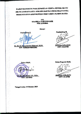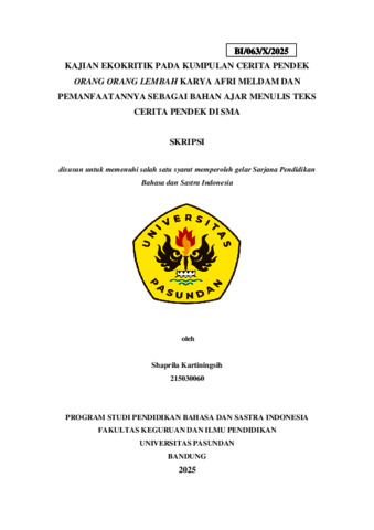 Kartiningsih Shaprila, 215030060 (2026) KAJIAN EKOKRITIK PADA KUMPULAN CERITA PENDEK ORANG ORANG LEMBAH KARYA AFRI MELDAM DAN PEMANFAATANNYA SEBAGAI BAHAN AJAR MENULIS TEKS CERITA PENDEK DI SMA. Skripsi(S1) thesis, FKIP UNPAS.