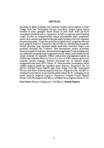 ABSTRAK Penelitian ini dilatar belakangi oleh rendahnya realisasi kinerja pegawai di Dinas Tenaga Kerja Dan Transmigrasi Provinsi Jawa Barat, dengan capaian kinerja terendah di antara perangkat daerah lainnya di Jawa Barat. Hasil pra-survei menunjukkan bahwa Employee engagement, Self efficacy pegawai masih tergolong rendah. Kondisi ini mengindikasikan adanya permasalahan dalam pengelolaan sumber daya manusia yang dapat berdampak negatif terhadap efektivitas organisasi dan pelayanan publik. Tujuan dari penelitian ini adalah untuk mengetahui seberapa besar pengaruh Employee Engagement dan Self Efficacy terhadap kinerja pegawai. Metode penelitian yang digunakan adalah pendekatan kuantitatif dengan jenis penelitian deskriptif dan verifikatif. Data dikumpulkan melalui penyebaran kuesioner kepada 84 responden, dan dianalisis menggunakan Teknik sampling yaitu non-probability sampling yang menggunakan teknik sampel jenuh dengan jumlah sampel sebanyak 84 responden. Metode analisis data yang digunakan adalah uji validitas dan reliabilitas, Method of Successive Interval (MSI), analisis regresi linier berganda, korelasi berganda, koefisien determinasi dan uji hipotesis dengan menggunakan alat bantu SPSS Statistic 26. Hasil penelitian menunjukkan bahwa terdapat pengaruh positif dan signifikan antara Employee Engagement dan Self Efficacy terhadap Kinerja Pegawai pada Dinas Tenaga Kerja Dan Transmigrasi Provinsi Jawa Barat. Besarnya pengaruh Employee Engagement Dan Self Efficacy terhadap Kinerja Pegawai secara simultan adalah sebesar 68,3%. Sedangkan secara parsial besarnya pengaruh Employee Engagement terhadap Kinerja Pegawai sebesar 33,6% dan pengaruh Self Efficacy terhadap Kinerja Pegawai sebesar 34,7%. Kata Kunci: Employee Engagement, Self Efficacy, Kinerja Pegawai
