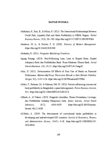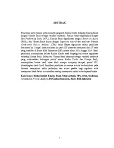 ABSTRAK Penelitian ini bertujuan untuk meneliti pengaruh Risiko Kredit terhadap Kinerja Bank dengan Ukuran Bank sebagai variabel moderasi. Risiko Kredit diproksikan dengan Non-Performing Loans (NPL), Kinerja Bank diproksikan dengan Return on Assets (ROA), dan Ukuran Bank diukur dengan Logaritma natural dari total aset. Metode Conditional Process Analysis (CPA) karya Hayes digunakan dalam penelitian kuantitatif ini. Sampel pada penelitian ini yaitu 108 observasi data panel dari 27 bank yang terdaftar di Bursa Efek Indonesia (BEI) antara tahun 2021 hingga 2024. Hasil penelitian menunjukkan bahwa Risiko Kredit tidak berpengaruh secara signifikan terhadap Kinerja Bank. Selain itu, Ukuran Bank berperan sebagai variabel moderasi yang melemahkan hubungan positif antara Risiko Kredit dan Kinerja Bank, menunjukkan bahwa bank besar lebih mampu menyerap dampak positif NPL dibandingkan bank kecil. Implikasi penelitian ini secara teoritis berkontribusi pada literatur manajemen risiko perbankan dan secara praktis bagi regulator serta manajemen bank dalam merumuskan strategi manajemen risiko serta ekspansi bisnis. Kata Kunci: Risiko Kredit, Kinerja Bank, Ukuran Bank, NPL, ROA, Moderasi, Conditional Process Analysis, Perbankan Indonesia, Bursa Efek Indonesia